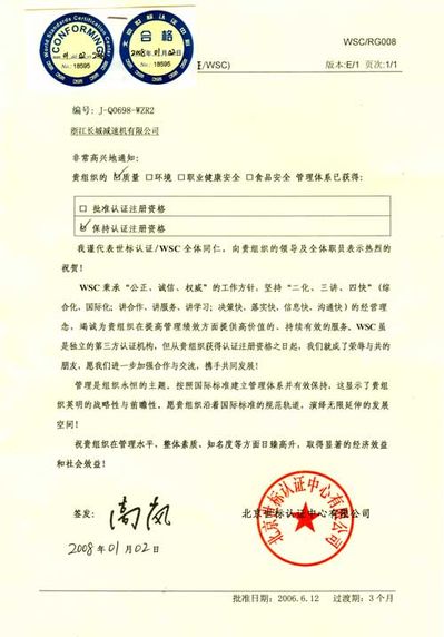 2007年11月26日~27日,北京世標(biāo)認(rèn)證中心專家組對(duì)我公司ISO9001標(biāo)準(zhǔn)質(zhì)量管理體系進(jìn)行了監(jiān)督審核,審核組專家對(duì)我公司領(lǐng)導(dǎo)和員工在質(zhì)量意識(shí)提高方面、基礎(chǔ)設(shè)施和工作環(huán)境改善等方面給予好評(píng),同時(shí)對(duì)需改進(jìn)的問題也提出了明確要求。最后給出審核結(jié)論:企業(yè)質(zhì)量管理體系保持良好,保持認(rèn)證注冊資格。