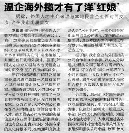 2008年6月11日上午,海外人才智力項目對接合作洽談咨詢會在溫舉行,我公司董事長虞培清等溫州民企負責(zé)人到現(xiàn)場與來自德、英、法等的12個外國專家組織(無償幫助發(fā)展中國家推薦人才的協(xié)會)和獵頭公司“進行了親密接觸”,并通過他們到海外攬才。此次洽談會,《溫州日報》和《溫州都市報》分別以“民企通過海外獵頭找人才和”“溫企海外攬才有了洋‘紅娘’”為標(biāo)題作了相關(guān)報道。