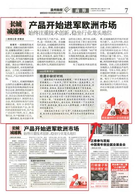 一流精致的技術實驗室、寬敞充裕的圖書資料館,溫馨整潔的職工宿舍——在浙江長城減速機有限公司采訪,你會感受到濃濃的企業(yè)文化氣息。作為國內攪拌設備行業(yè)的隱形冠軍,在金融危機面前,該企業(yè)不斷研發(fā)新品,努力開拓新市,尋求發(fā)展的新起點。上月底,長城減速機已與烏克蘭、土耳其客商簽訂合作協(xié)議,產品開始進軍歐洲市場。
