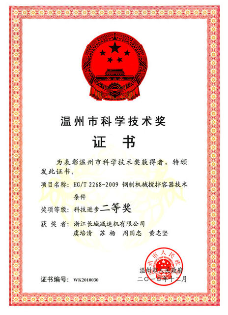 化工行業(yè)標(biāo)準(zhǔn)HG/T 2268-2009《鋼制機(jī)械攪拌容器技術(shù)條件》溫州市科學(xué)技術(shù)二等獎(jiǎng)證書