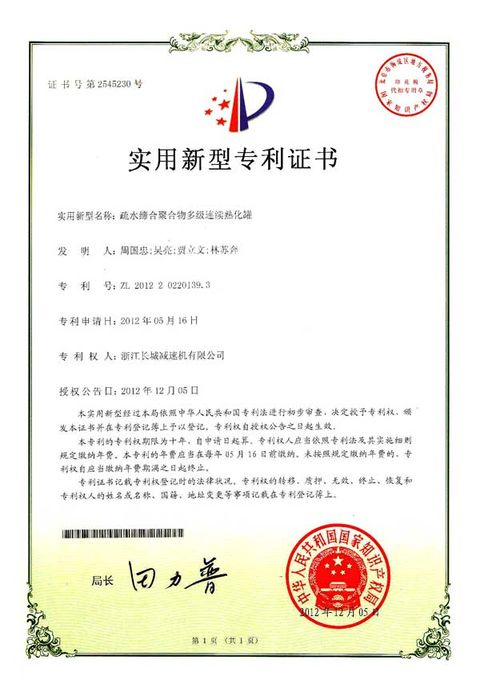 "疏水締合聚合物多級連續(xù)熟化罐"--實用新型專利證書