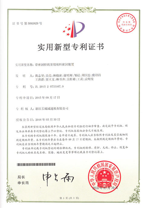 熱烈祝賀我司“帶密封腔的釜用填料密封裝置”獲國家實用新型專利