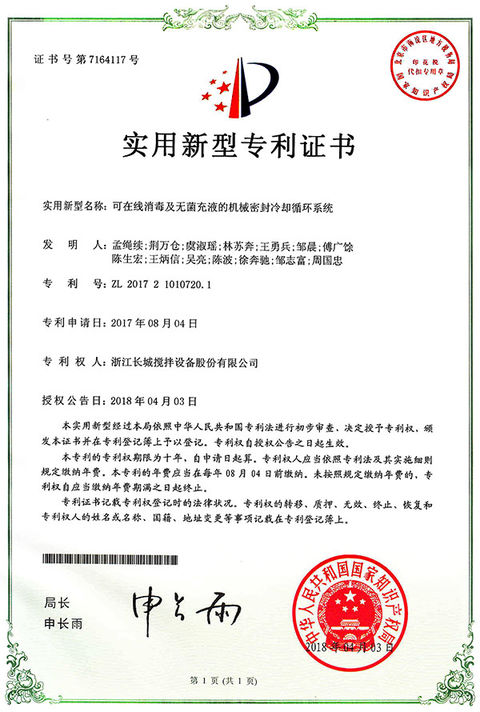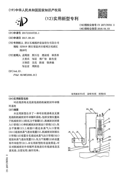熱烈祝賀我司“可在線消毒及無菌充液的機(jī)械密封冷卻循環(huán)系統(tǒng)”獲國(guó)家實(shí)用新型專利