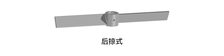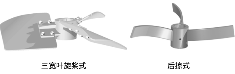 三寬葉旋槳式攪拌器由三片螺旋圓錐曲面寬葉組成,具有很大的湍流擴(kuò)張能力。而后掠式攪拌器能實(shí)現(xiàn)較大的上下循環(huán)流場(chǎng),兩者同時(shí)使用能實(shí)現(xiàn)流體在攪拌槽內(nèi)的均勻分布。