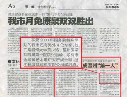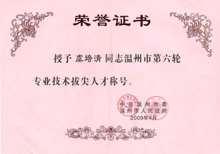 2009年2月24日,浙江省人事廳正式公布了我省2008年度享受政府特殊津貼人員名單,其中溫州市享此殊榮的只有5人,而鹿城區(qū)僅我司虞培清董事長(zhǎng)一人。      政...