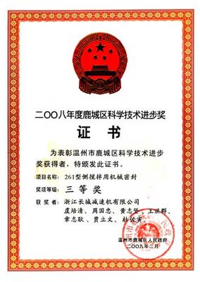 “261型側(cè)攪拌用機(jī)械密封”鹿城區(qū)科學(xué)技術(shù)進(jìn)步三等獎證書